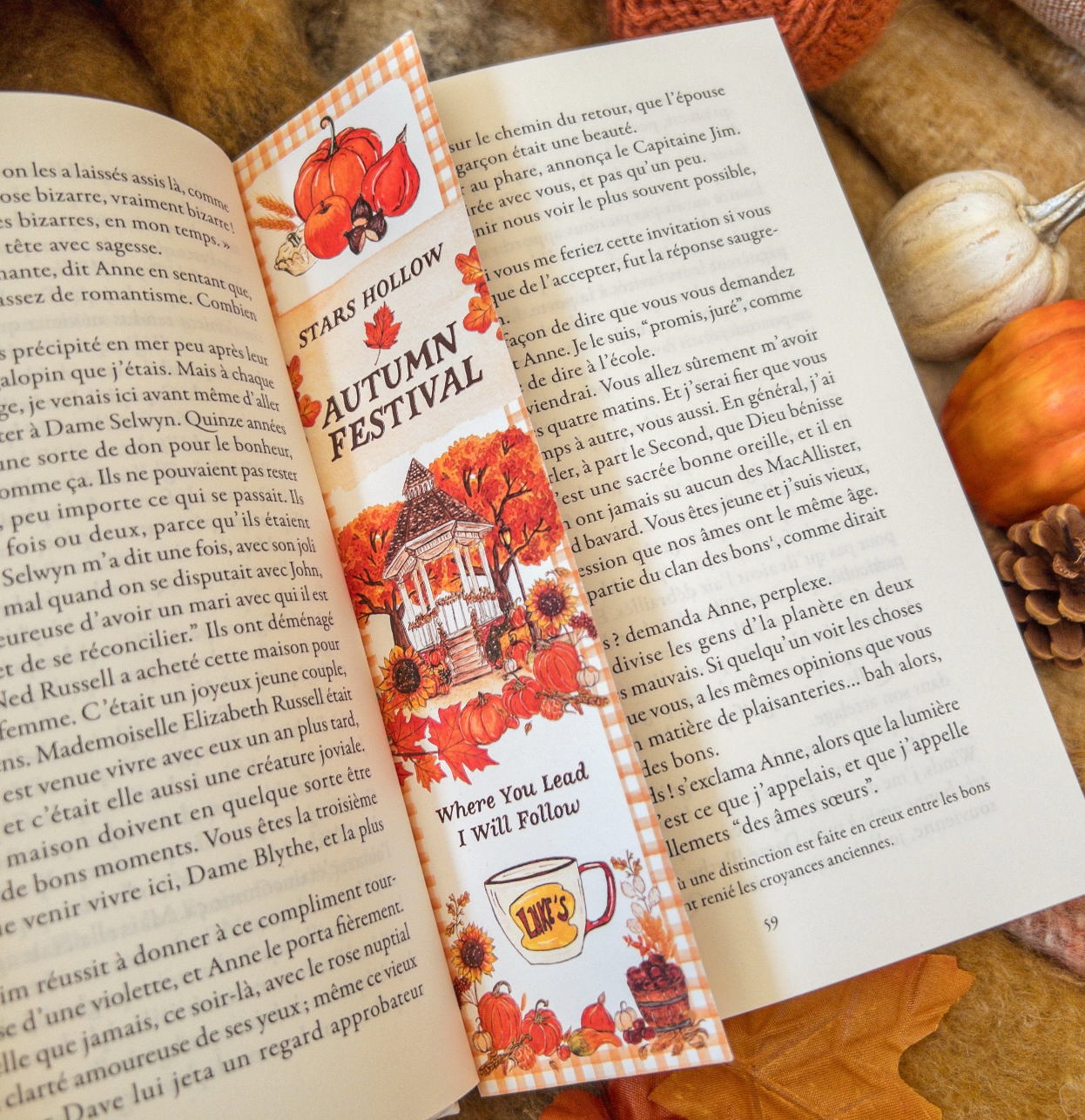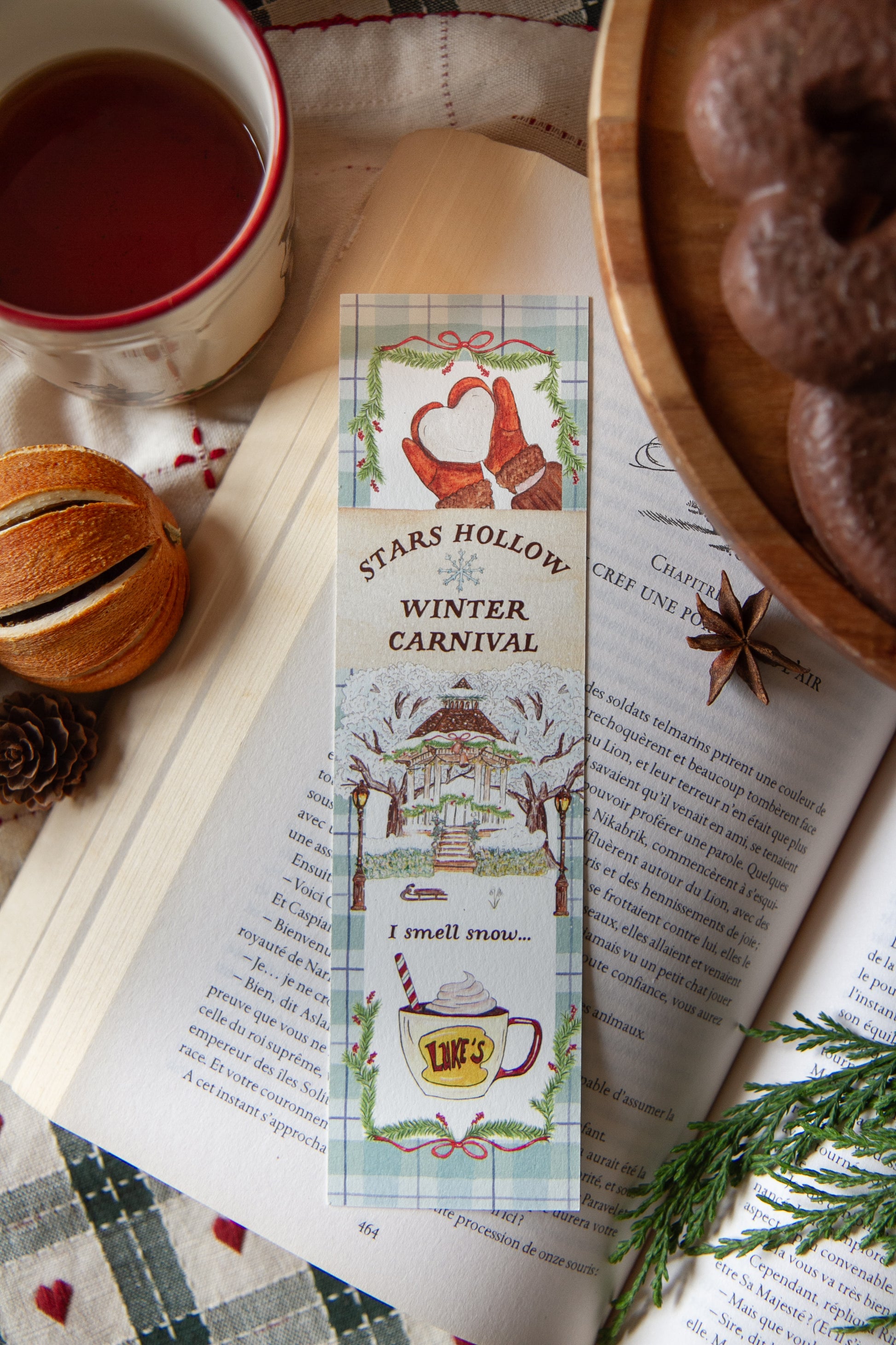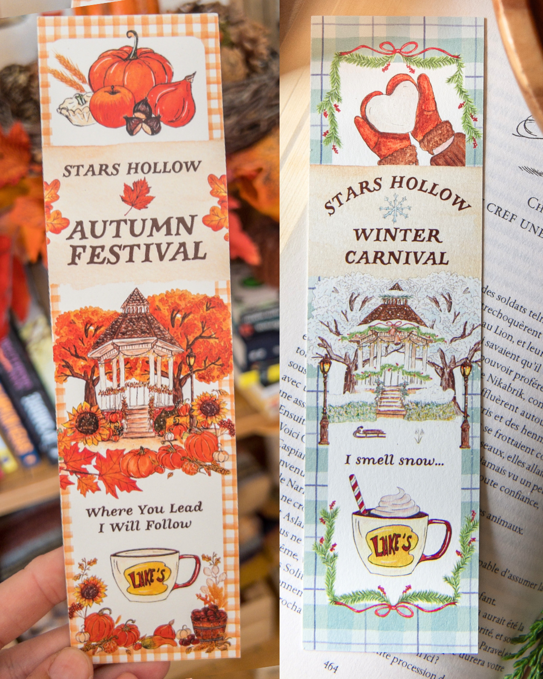 Marque-pages illustré recto-verso sur le thème de L'autumn Festival et du Winter Carnival de Stars Hollow, pour accompagner vos lectures de la saison.